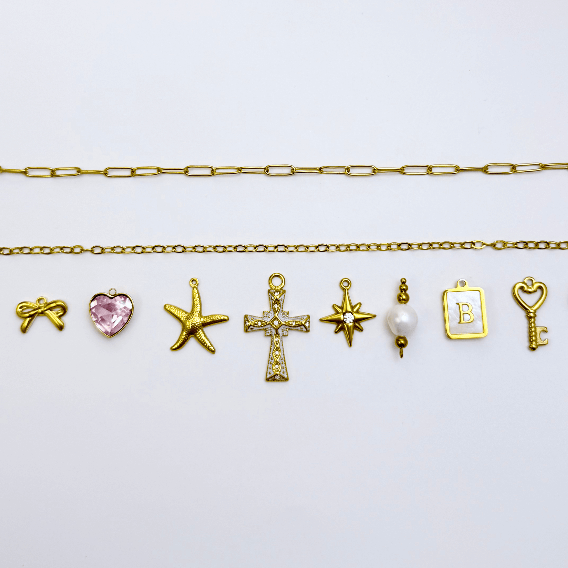 The Design Your Own Gold Charm Necklace – Medium Linked Chain is the perfect balance of bold and timeless. With 3–5 mm links, it has a confident presence that still feels effortless for everyday wear. Add your choice of charms to tell your story or gift something meaningful. Waterproof, hypoallergenic, and handcrafted to last.