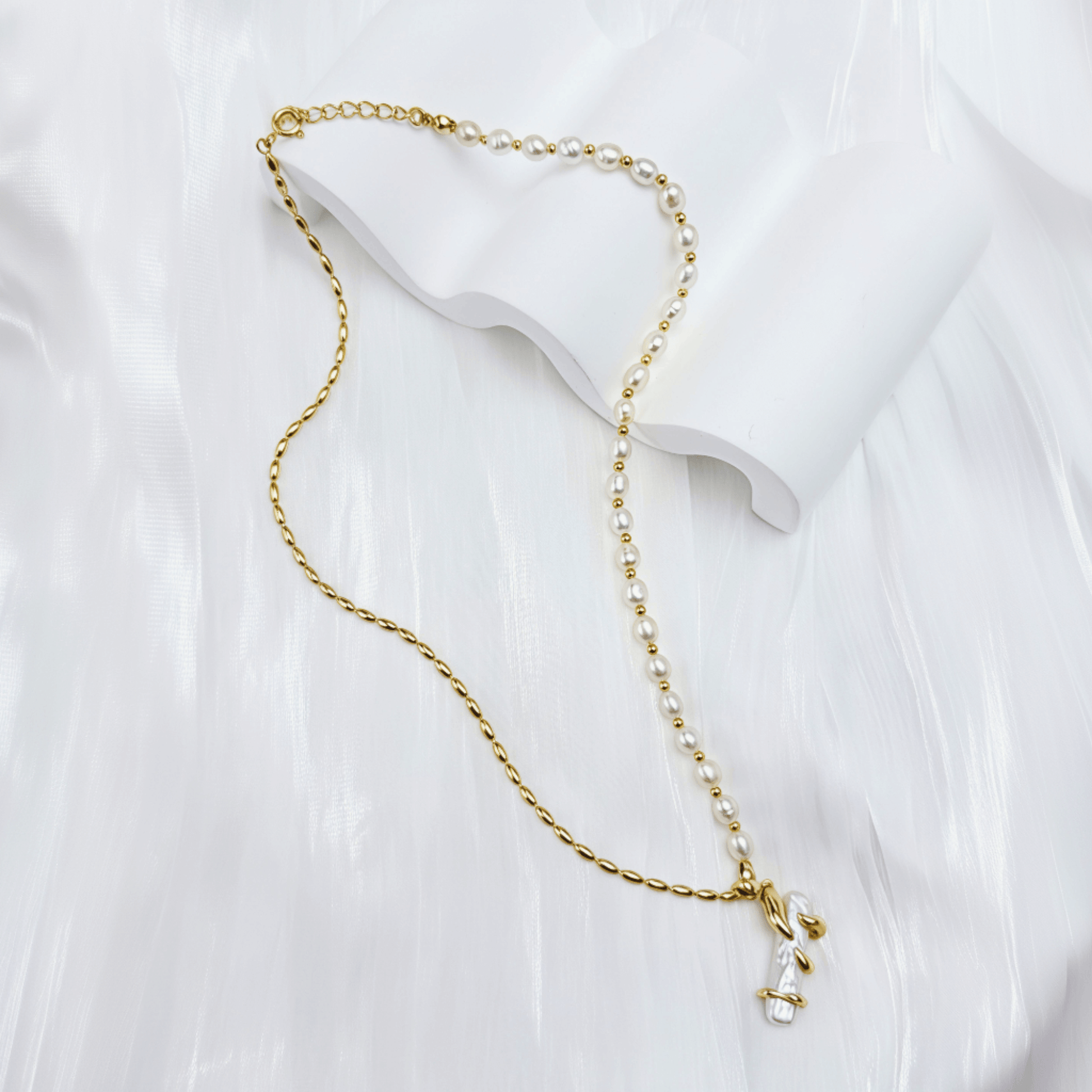 • Gold and silver chains with loose freshwater pearls on a soft beige fabric background, symbolising MXW Jewellery’s quality materials and craftsmanship.